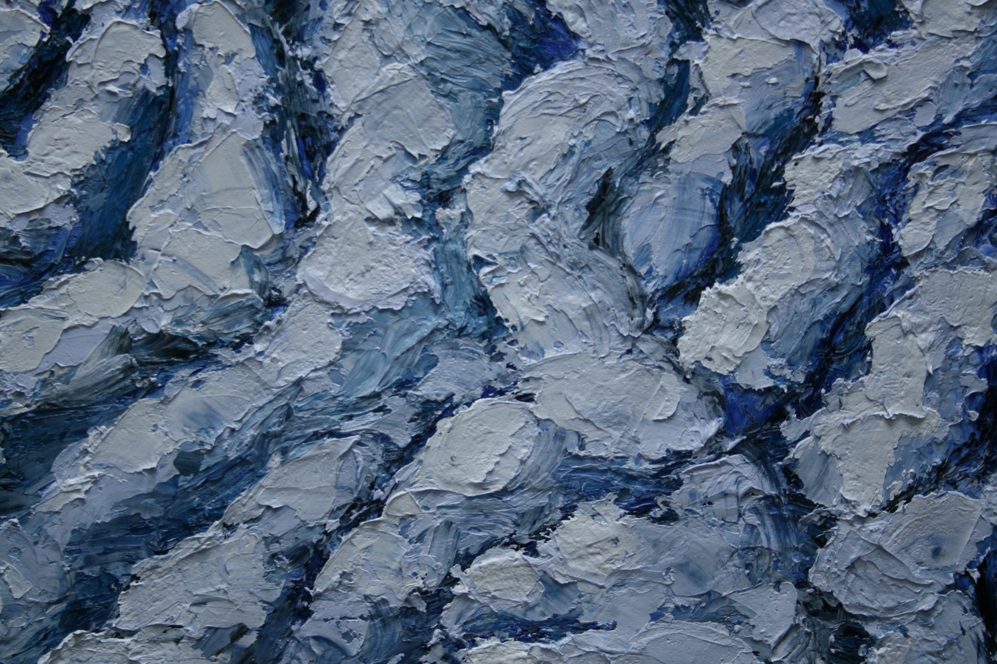 The palette is subtle: soft whites creating highlights on the cloud tops, cool grays and hints of blue-violet in the shadowed furrows. The textured surface emphasizes the sculptural quality of weather systems—solid, dimensional, almost tangible.