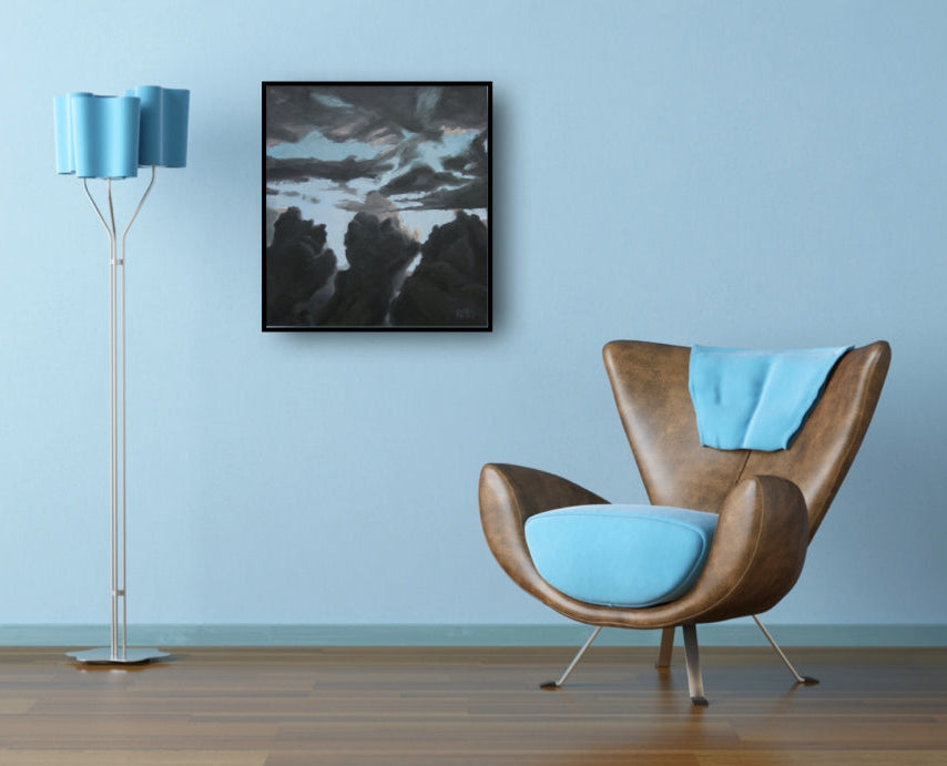 Over Los Angeles after a rainstorm, clouds gather in dense, mysterious formations—layers of deep gray and charcoal building across the canvas. The atmosphere holds the weight and drama of weather just passed, shadows and light creating depth within the cloud mass.