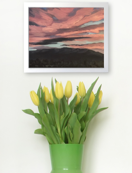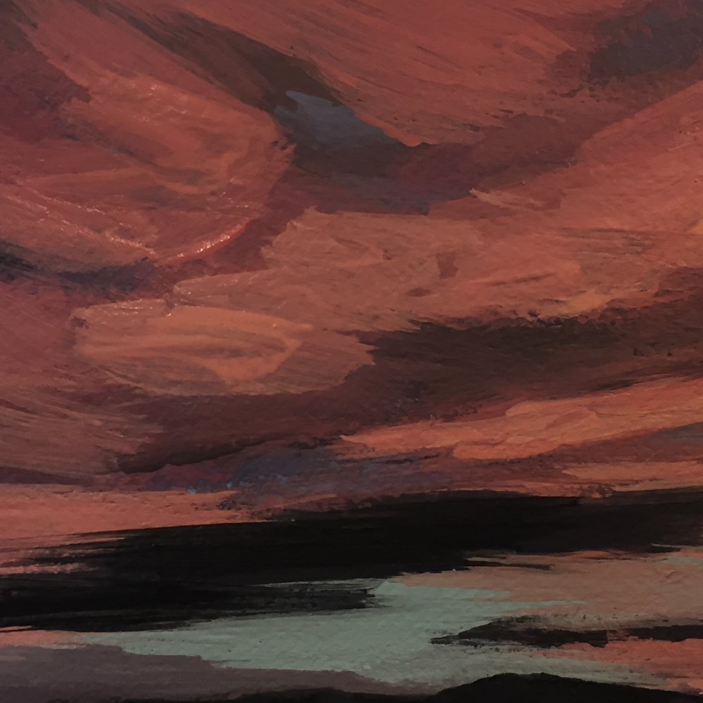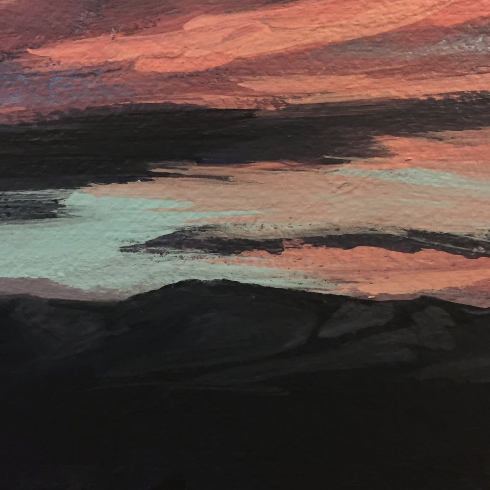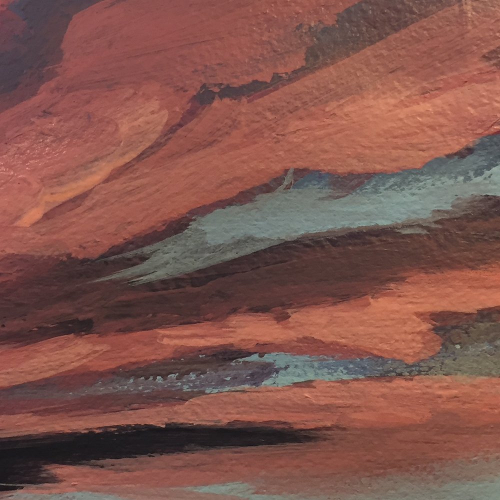 A study of the Sangre de Cristo Mountains in northern New Mexico, where layers of dark brown and smokey sienna mountain ridges recede into the distance beneath a dramatic sky. Above, clouds rendered in soft pinks, lavenders, and pale blues drift across the upper atmosphere, creating a delicate contrast with the earthy mountain forms below. The composition captures the quiet beauty and scale of the high desert range at dusk.