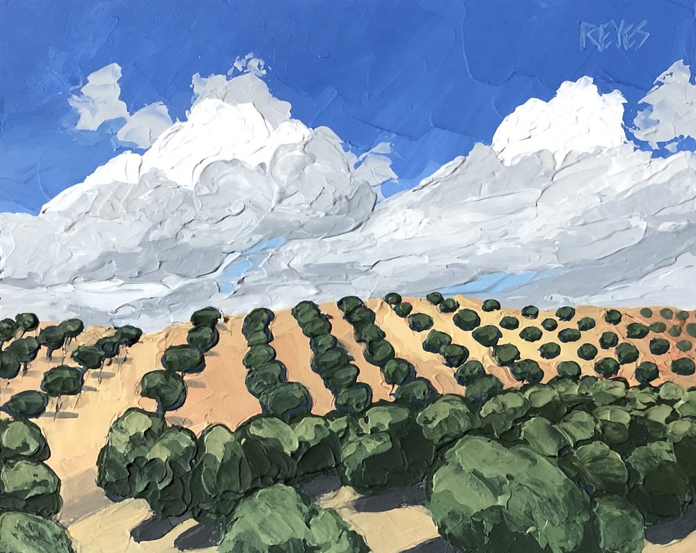 A fleeting view from the window of the high-speed train between Barcelona and Madrid—the final piece in this Spanish journey. The countryside unfolds in layers of warm earth tones and soft greens, where cultivated fields meet distant hills beneath a luminous sky. The piece captures the quiet beauty of the Iberian landscape, distilling hours of travel into a single, contemplative moment of light and terrain.
