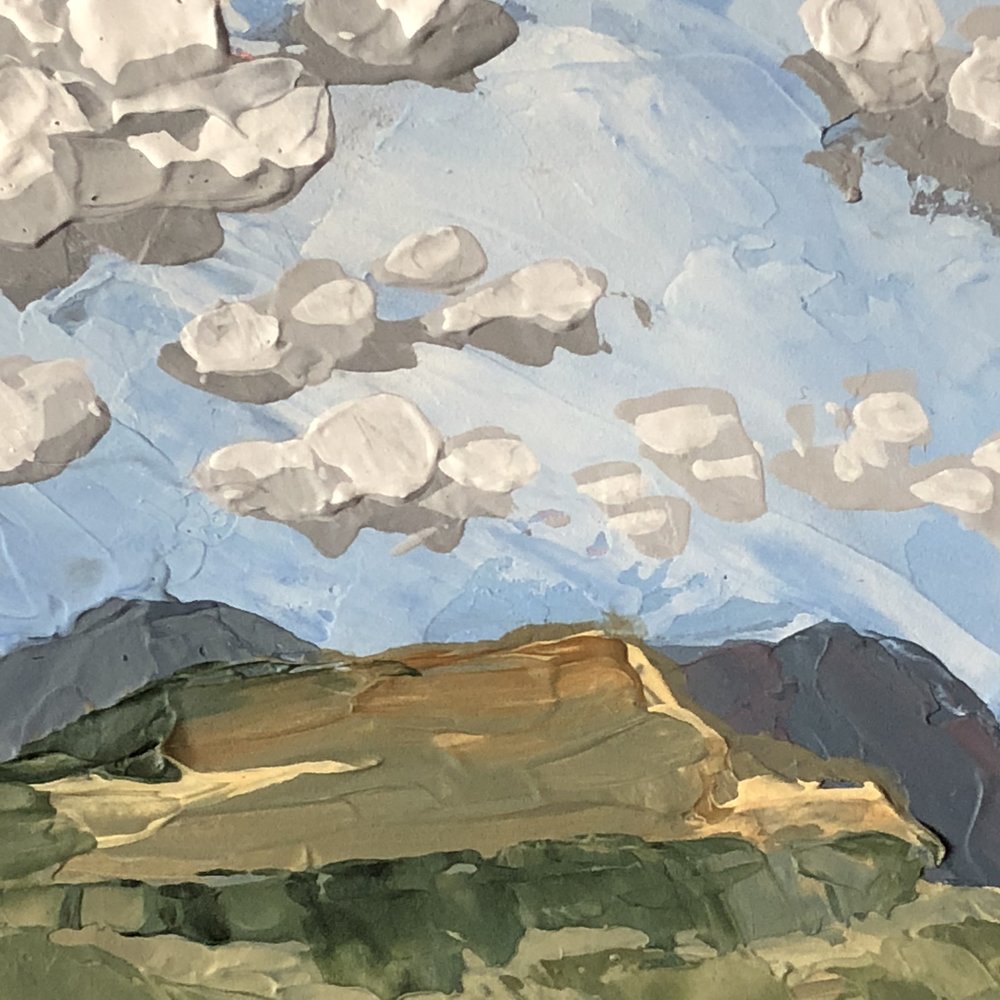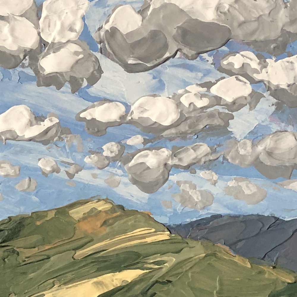 A fleeting view from the window of the high-speed train between Barcelona and Madrid. The Spanish countryside unfolds beneath a sky alive with movement—clouds drift and gather in soft whites and grays, casting shifting shadows over the patchwork fields below. Warm earth tones and muted greens anchor the composition, while the ever-changing sky adds drama and depth to the Iberian landscape in motion.