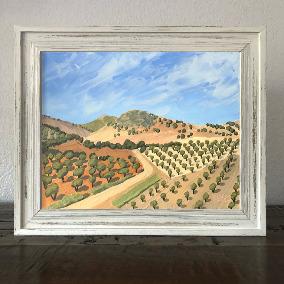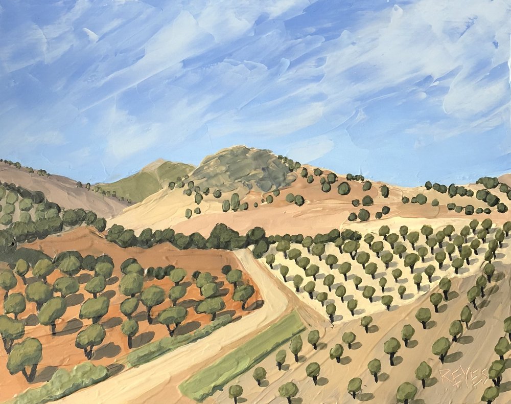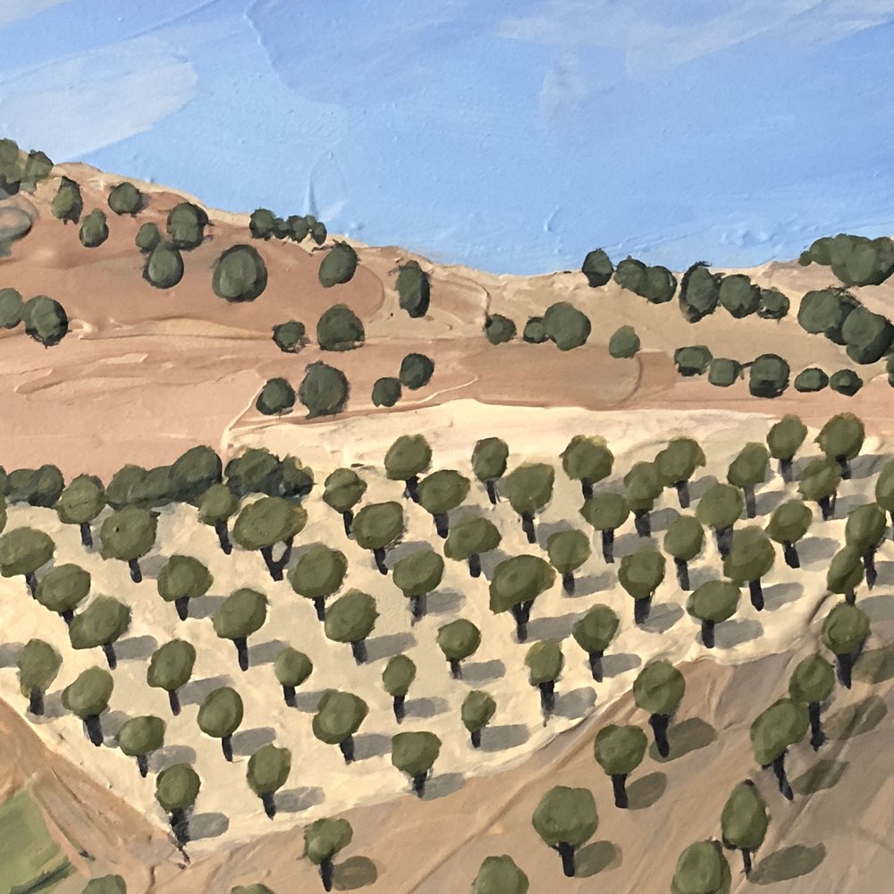 A fleeting view from the window of the high-speed train between Barcelona and Madrid. The Spanish countryside unfolds in a tapestry of olive groves—rows of silvery-green trees stretching across rolling hills beneath a soft, luminous sky. Warm earth tones and muted greens capture the timeless agricultural landscape of central Spain, where cultivation and terrain merge into rhythmic patterns.