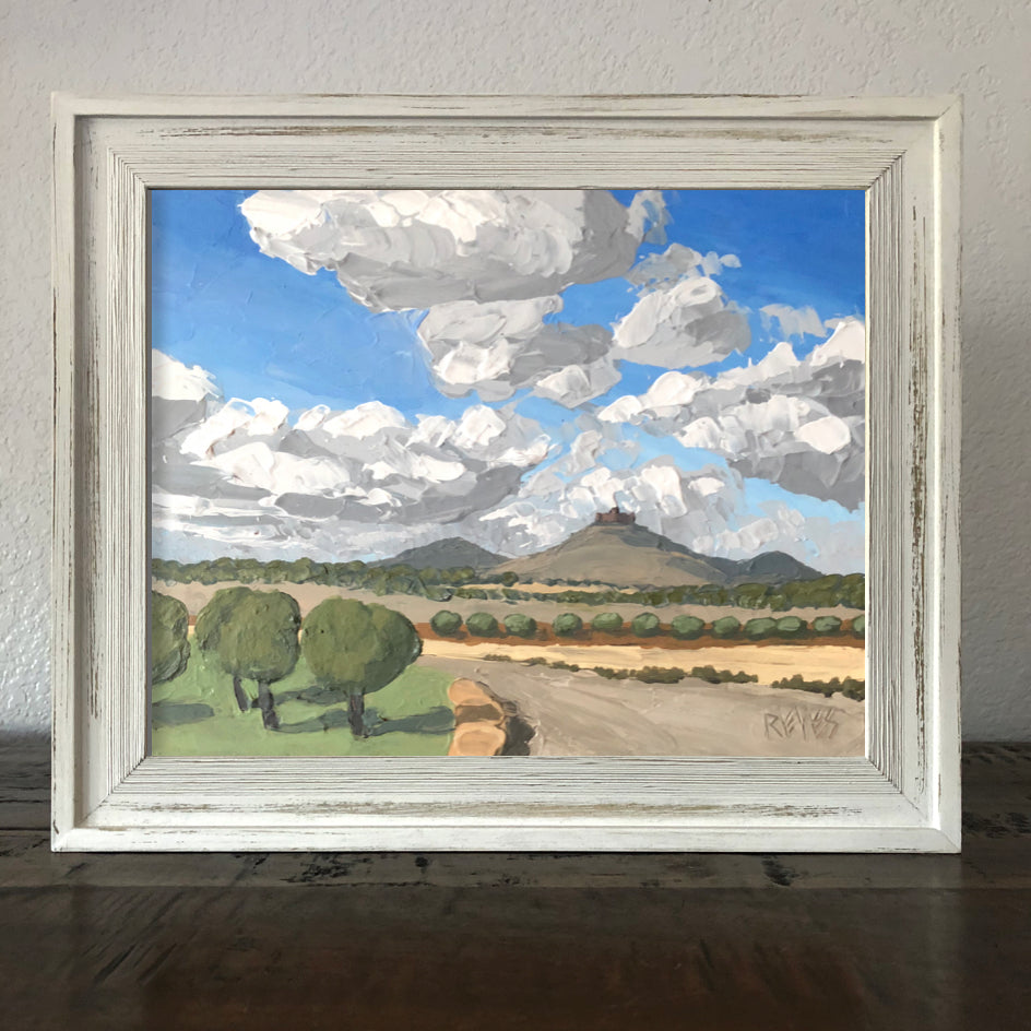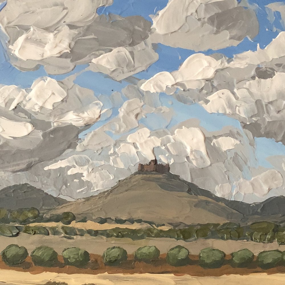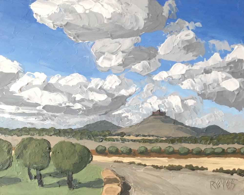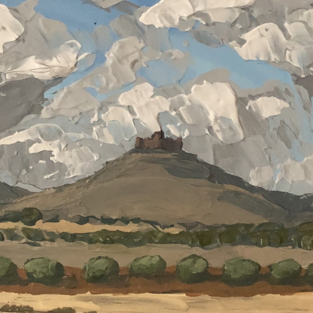 A fleeting view from the window of the high-speed train between Barcelona and Madrid. The Spanish countryside unfolds in layers of warm earth tones and soft greens, with a distant castle perched on a hill—a quiet sentinel overlooking the patchwork fields below. The piece captures the timeless beauty of the Iberian landscape, where history and terrain merge into a single, sweeping vista.