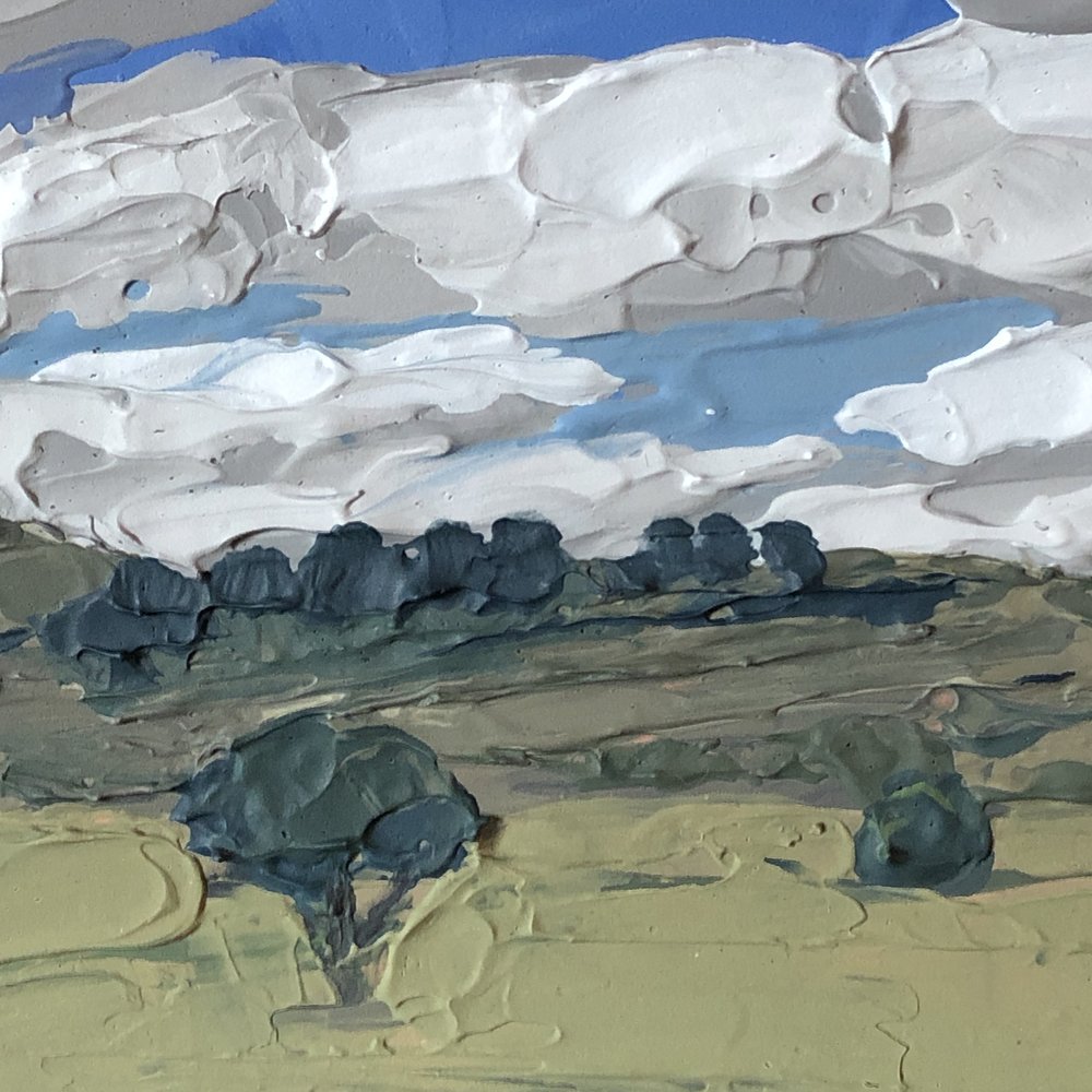 A fleeting view from the window of the high-speed train between Barcelona and Madrid. The Spanish countryside unfolds beneath a sky of deep indigo—a rich, saturated blue that crowns the composition and draws the eye upward. Below, warm earth tones and muted greens capture the rolling terrain, creating a striking contrast between the dramatic sky and the quiet landscape. The piece distills a moment of transition, where light and color shift across the Iberian vista.