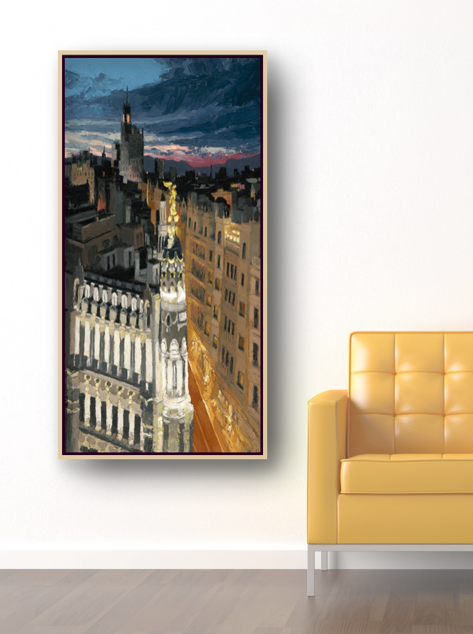 The vertical format emphasizes Madrid's expansive urban landscape, where neoclassical buildings and modern structures coexist under the shifting colors of twilight. The warm glow from street lamps washes across facades as cooler atmospheric tones settle over the city—that magical moment when day gives way to evening.