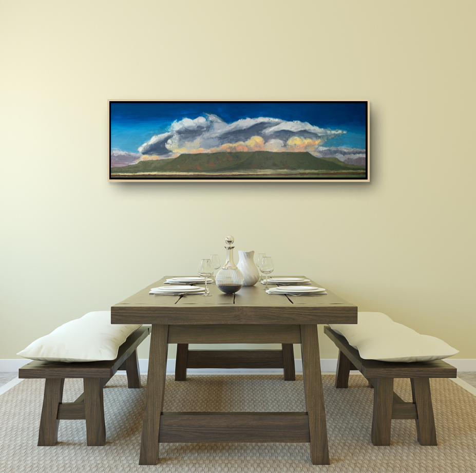 An original acrylic painting capturing the dramatic moment when a massive storm system builds above a mesa in northern New Mexico. This expansive panoramic composition emphasizes the scale and power of the approaching weather—towering clouds gathering force over the high desert plateau.