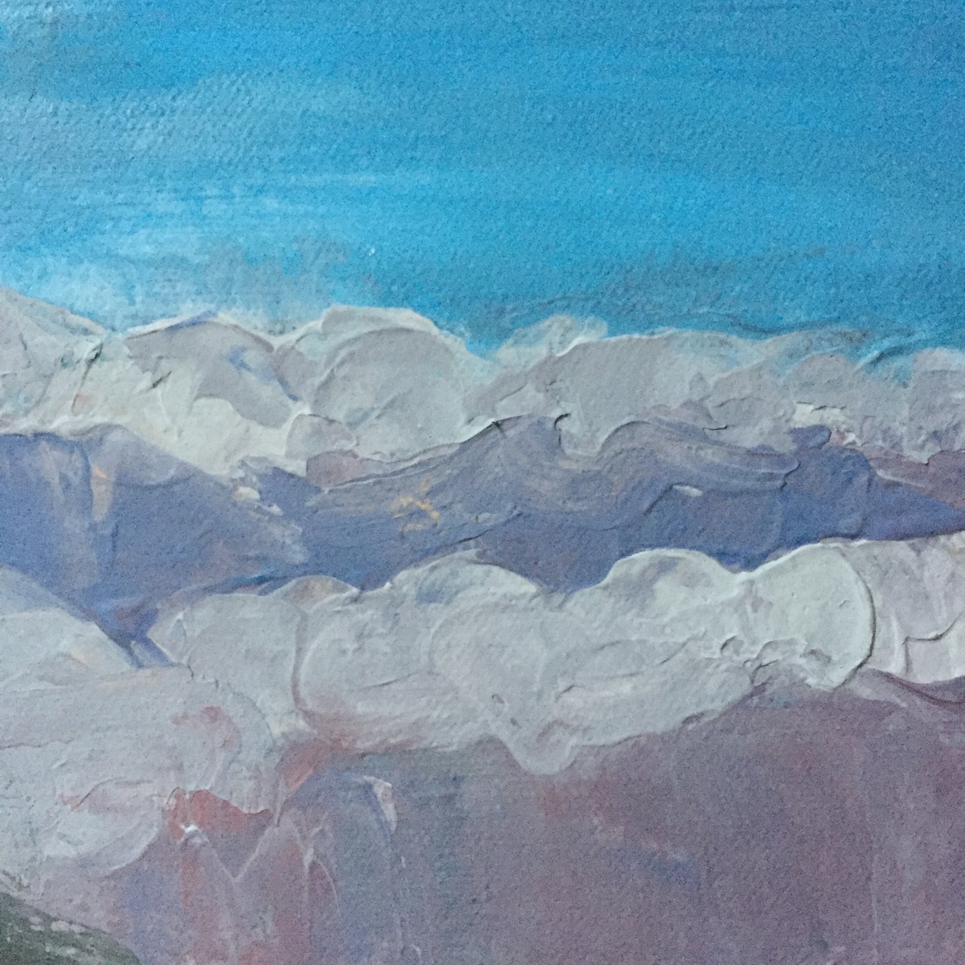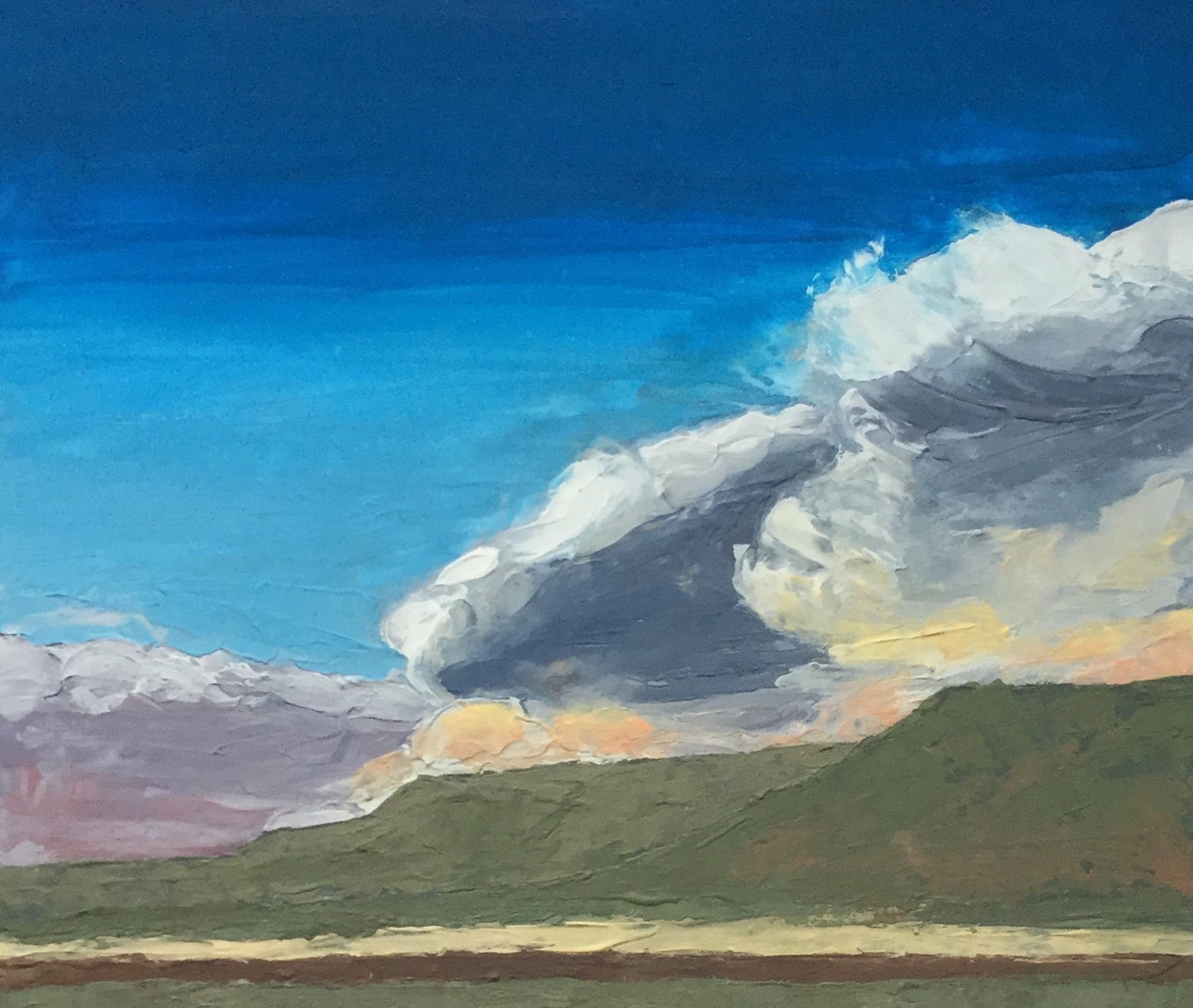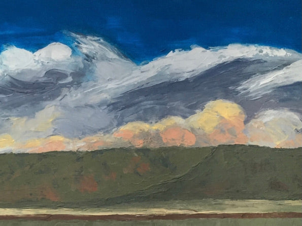 Painted from a fleeting roadside encounter on the journey north toward Colorado, this piece captures the raw atmospheric drama that defines the high desert Southwest. The mesa's horizontal expanse mirrors the storm's gathering intensity above, creating a tension between earth and sky that speaks to the region's elemental beauty and unpredictable weather patterns.