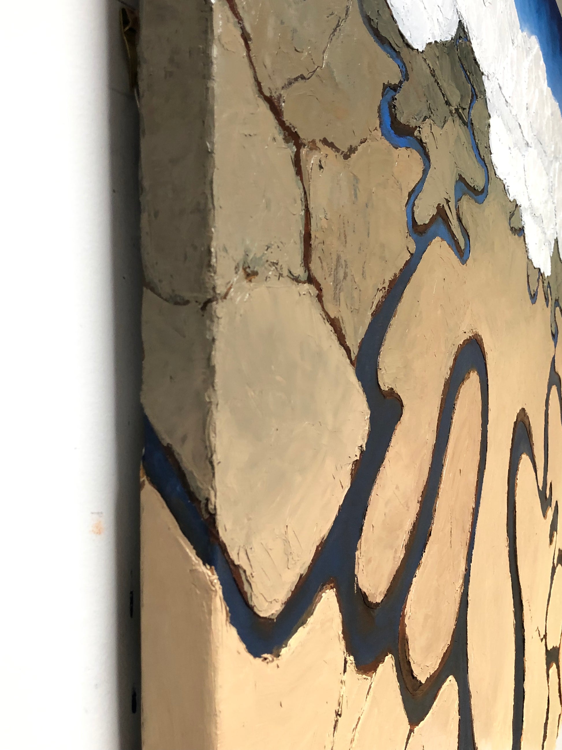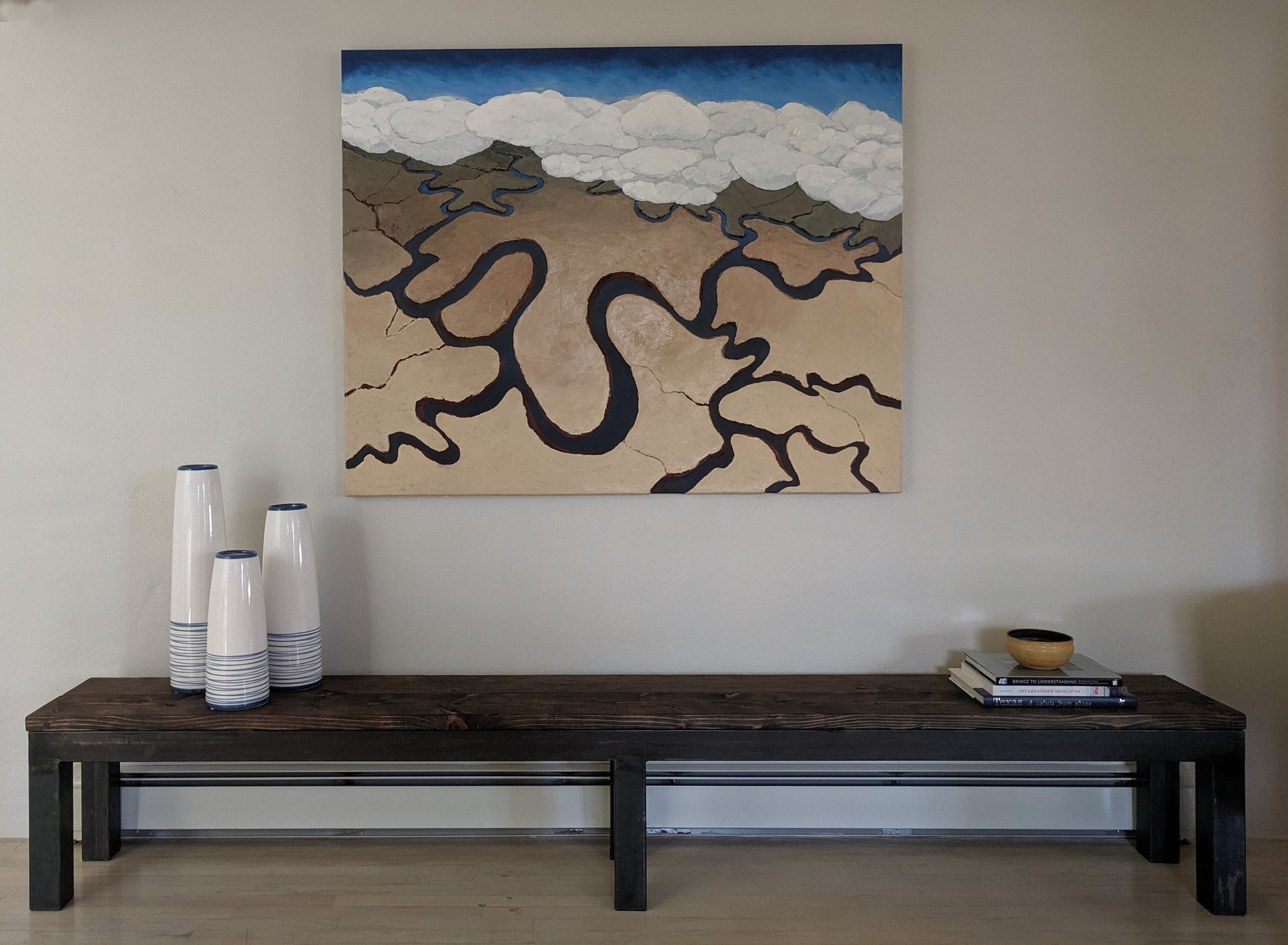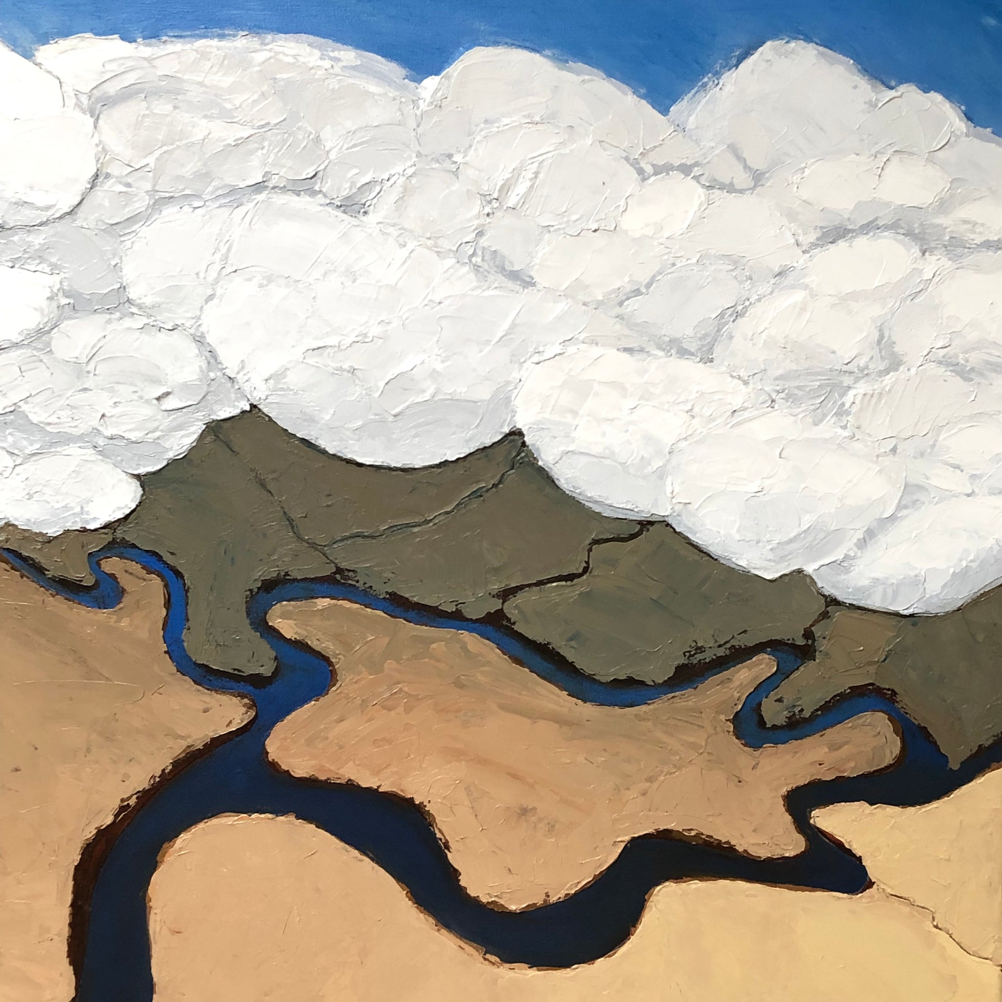 "Rio del Desierto" is the largest piece to date from my Aeroscapes™️ Series, an ongoing body of work I've developed over the past decade transforming views from airplane window seats into original landscape art. This piece captures the moment I descended through clouds on approach into Albuquerque, then reimagines the scene with a network of rivers flowing through our high desert landscape—a vision of water abundance in an arid land.