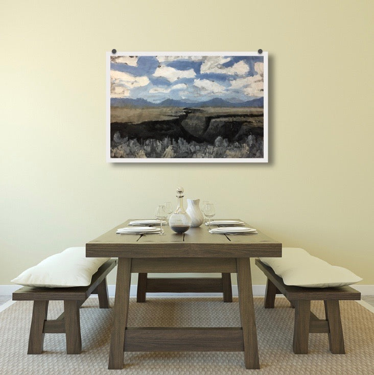An expressive interpretation of the Rio Grande Gorge as seen on the approach to Taos, New Mexico. Rendered in acrylic and ink on paper, the composition captures the dramatic rift in the high desert landscape—bold, gestural marks evoke the raw power and scale of the gorge cutting through the plateau. Layers of texture and color convey the rugged beauty and geological drama of this iconic Northern New Mexico landmark.